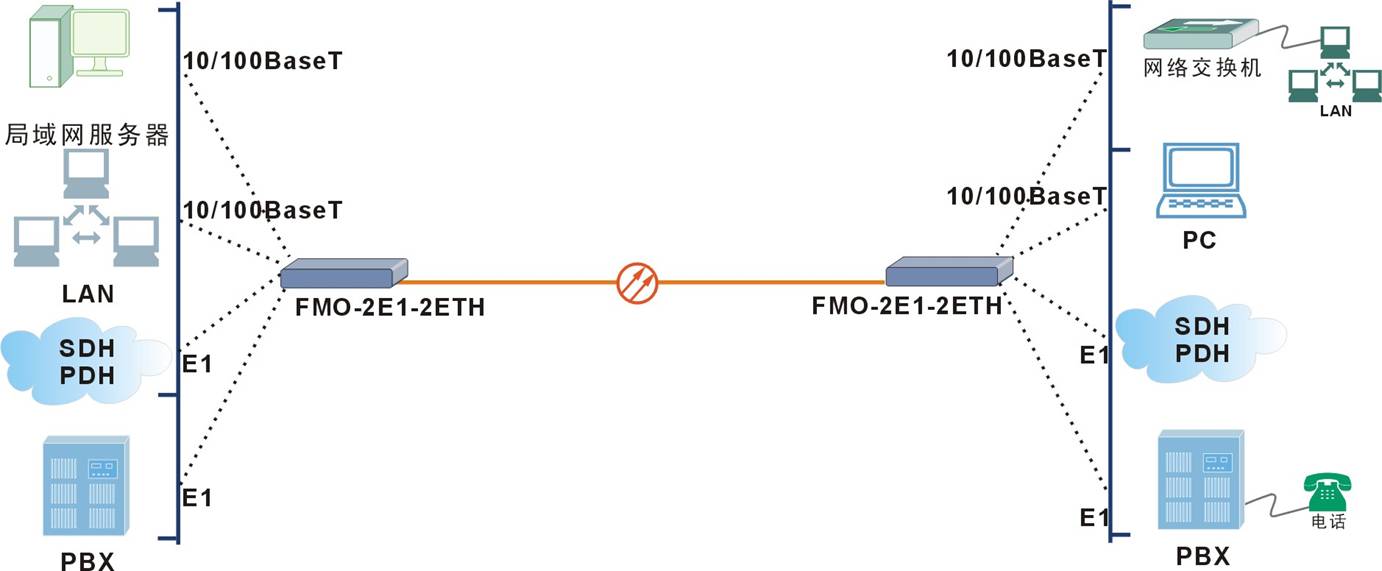 可以和4E1光端机(FMO-120)互连,实现以太网数据向上一级传输;