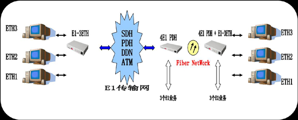 PDH中第4个E1用来与E1复用设备对接,另外3个E1可以接其它业务。以太网接口总带宽为1984Kbps。本复用设备是一种高性能、自适应式远程以太网桥,广泛应用于金融,证券,安全部门等需要提供两个不同的网络,并且这两个网络能在物理上完全隔离的场合。如金融系统的业务网、内部办公网不能和其业务网联在一起,本接口复用器可以解决这个难题并特别适用于专网用户,能为专网用户提供单E1通道的数据和语音的同时接入。
