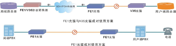 可以和V.35光纤MODEM成对使用,也可以实现(以太网网桥)-----(E1光Modem)-----(以太网光Modem)的网络结构。
